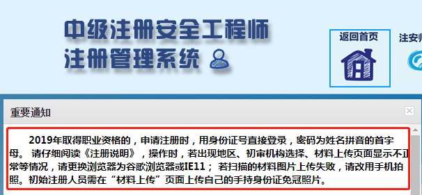 2019年取得职业资格的,申请注册时,用身份证号直接登录,密码为姓名拼音的首字母。请仔细阅读《注册说明》,操作时,若出现地区、初审机构选择、材料上传页面显示不正常等情况,请更换浏览器为谷歌浏览器或IE11;若扫描的材料图片上传失败,请改用手机拍照。初始注册人员需在“材料上传”页面上传自己的手持身份证免冠照片。