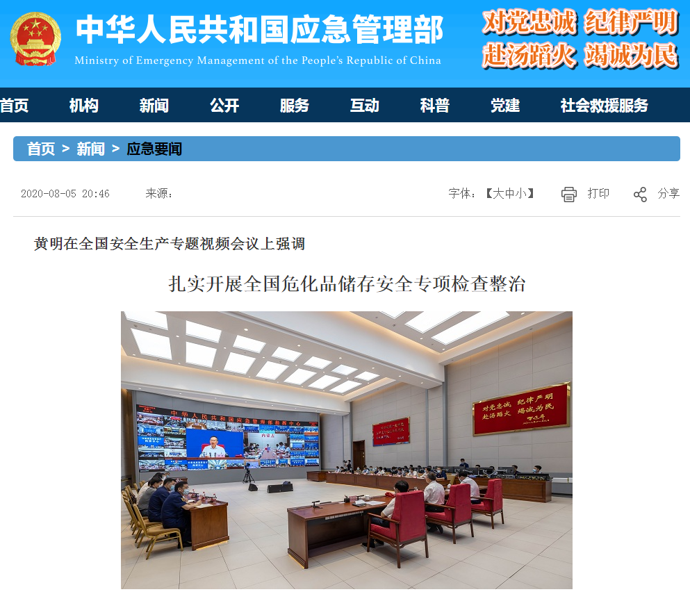 8月5日,国务院安委会办公室、应急管理部召开全国安全生产专题视频会议,认真贯彻落实习近平总书记关于安全生产一系列重要指示精神,深刻吸取黎巴嫩贝鲁特重大爆炸事件教训,部署开展全国危化品储存安全专项检查整治,深入开展天津港“8·12”等重特大事故整改措施落实情况“回头看”,举一反三狠抓其他行业领域安全防范责任措施落实,坚决遏制重特大事故,确保安全生产形势稳定。国务院安委会副主任、应急管理部党委书记黄明主持会议并讲话。孙华山、琼色等部领导出席会议。