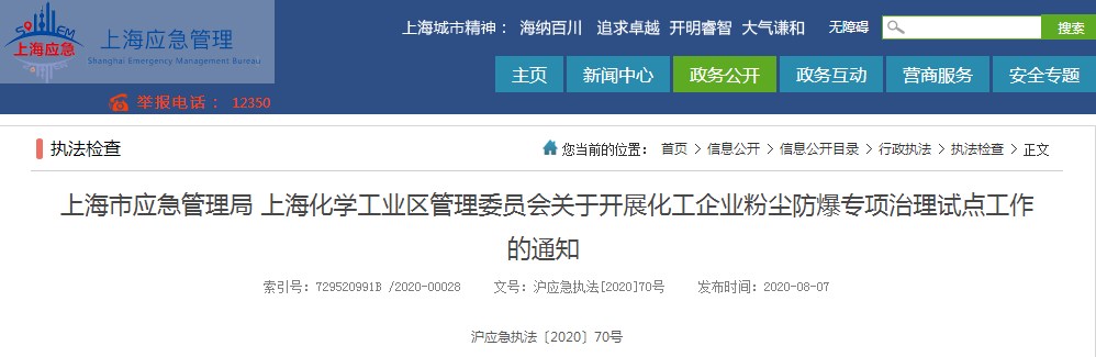 上海市应急管理局发布:上海化学工业区管理委员会关于开展化工企业粉尘防爆专项治理试点工作的通知。