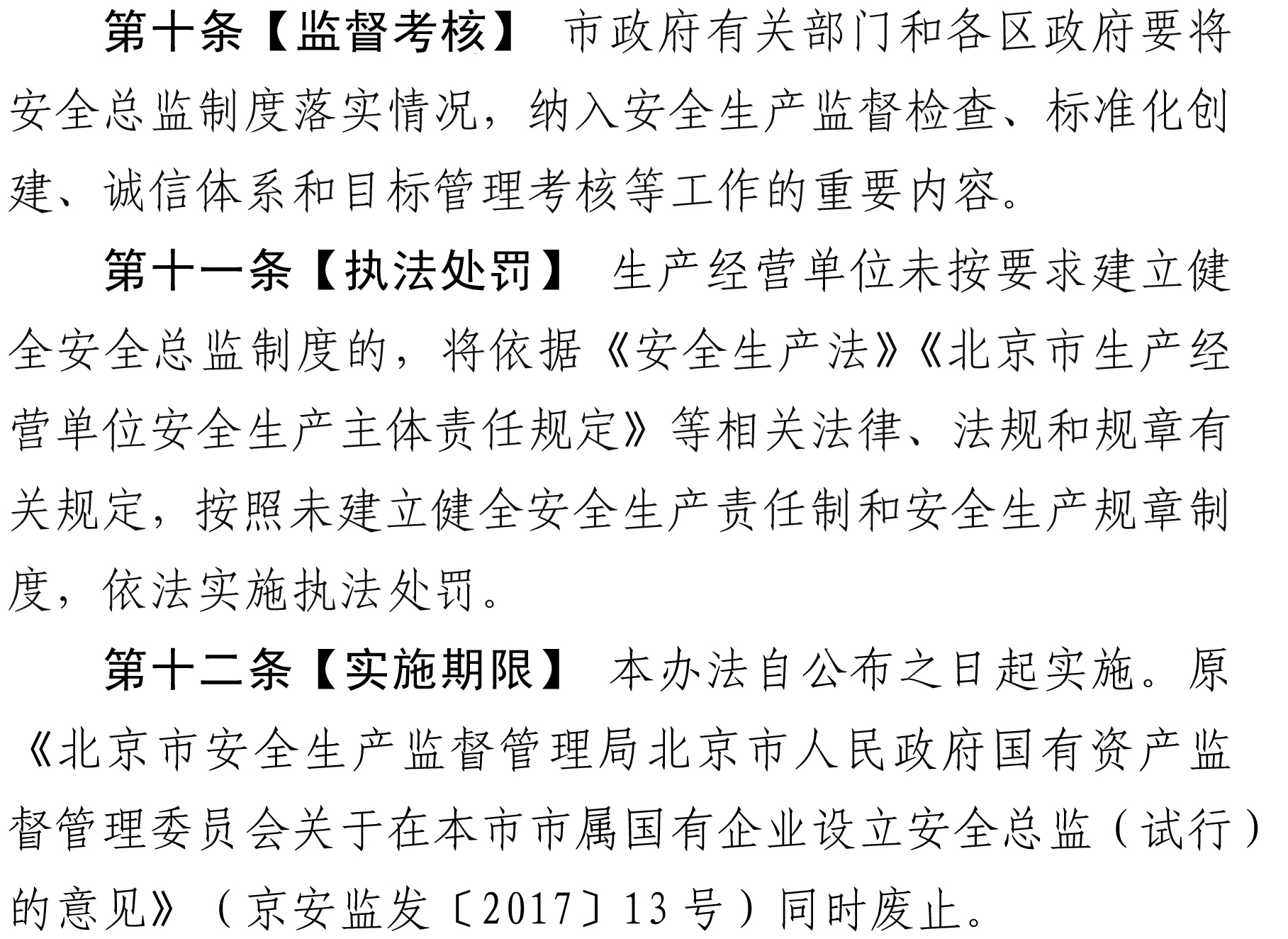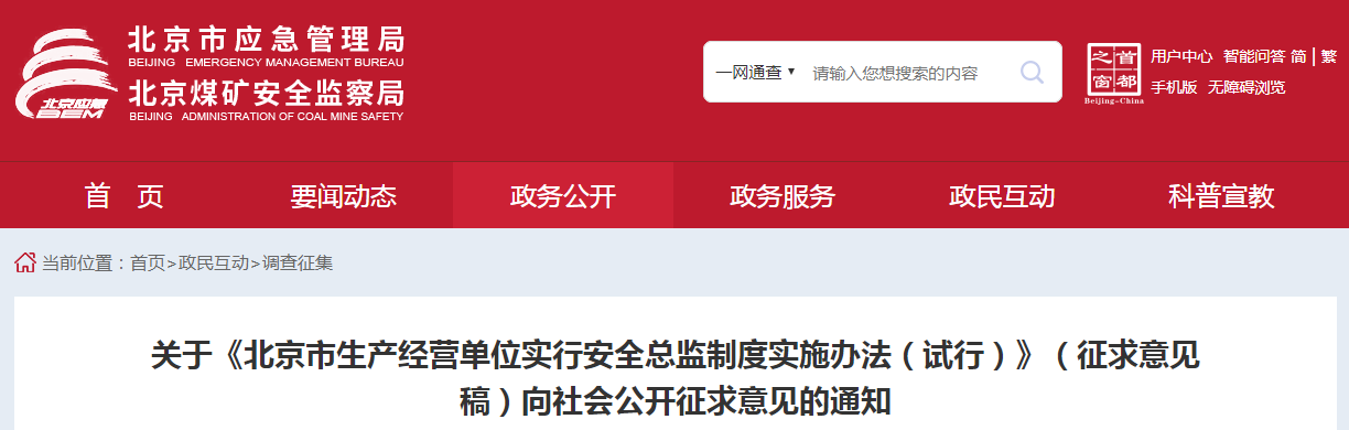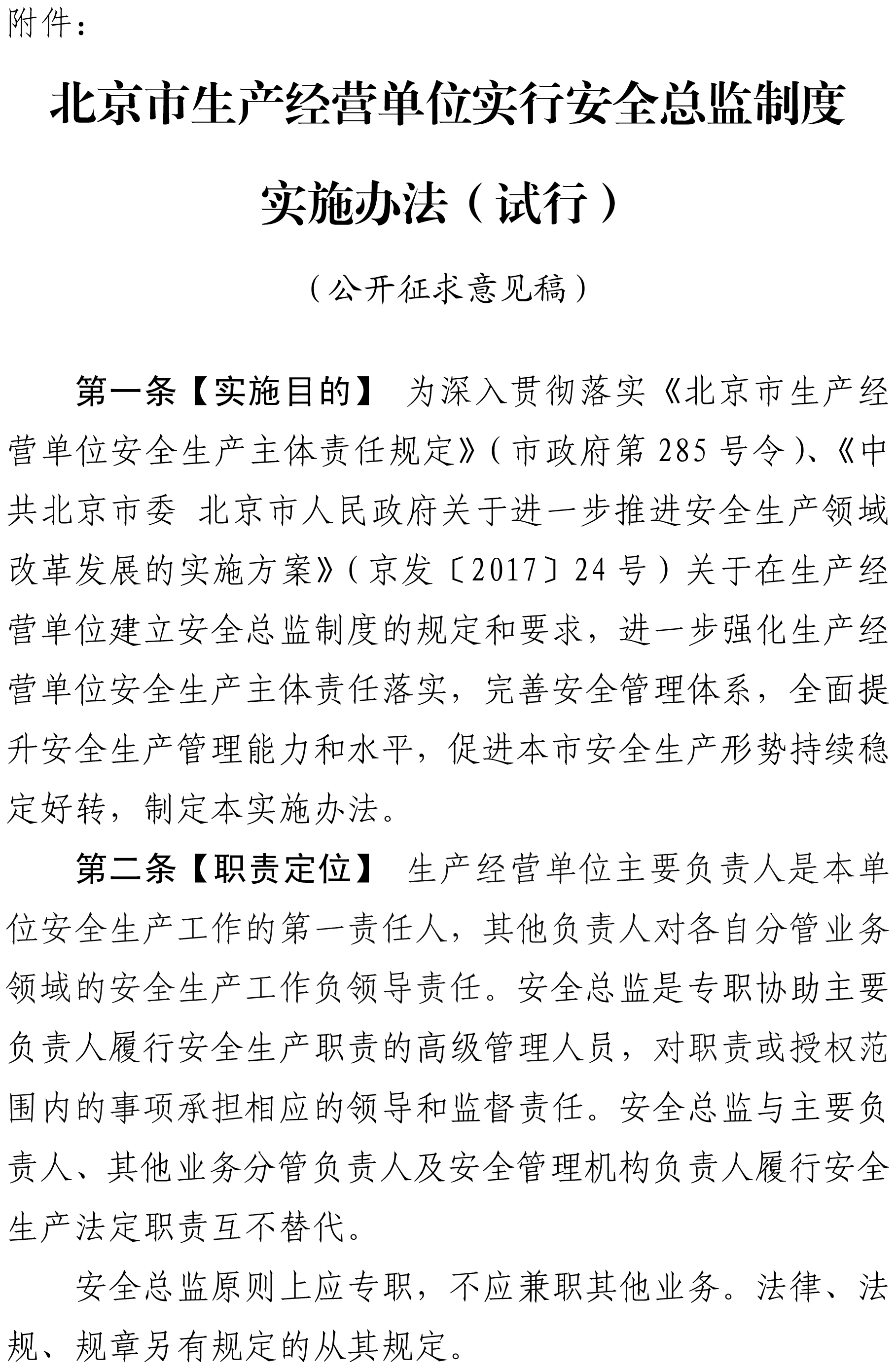 近日,北京市应急管理局发布关于《北京市生产经营单位实行安全总监制度实施办法(试行)》(征求意见稿)向社会公开征求意见的通知。
