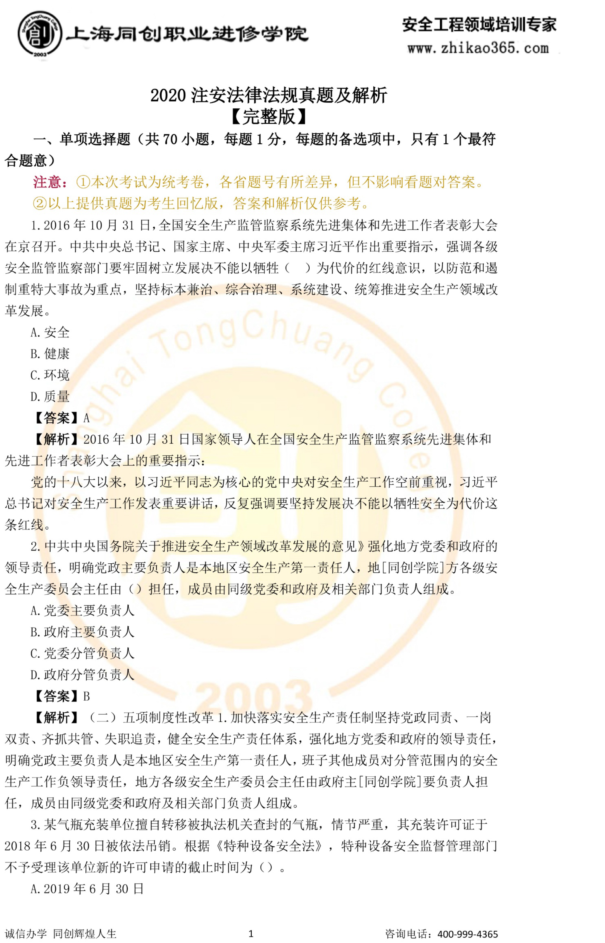 2020年注册安全工程师《法律法规》考试真题,答案解析,完整版~