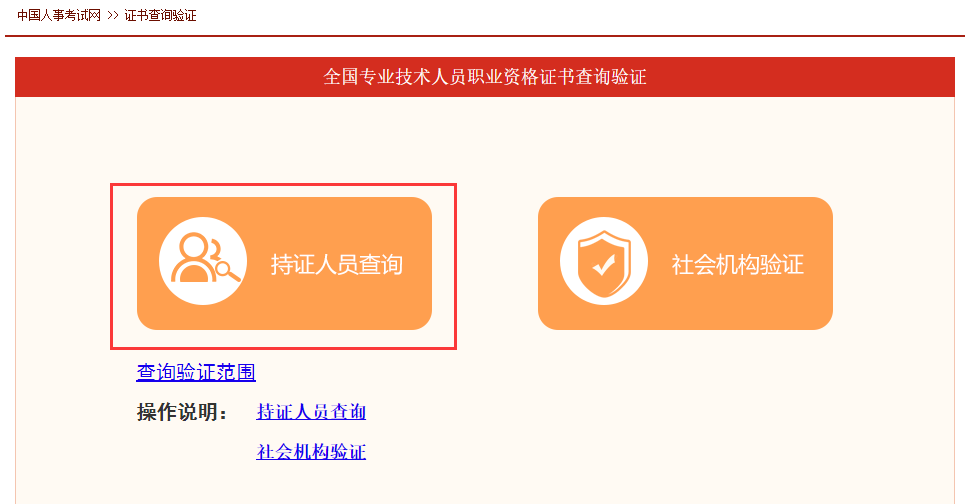 点击【证书查询验证】——【持证人员查询】,进入【全国专业技术人员职业资格证书查询验证系统(持证人员查询)】平台。